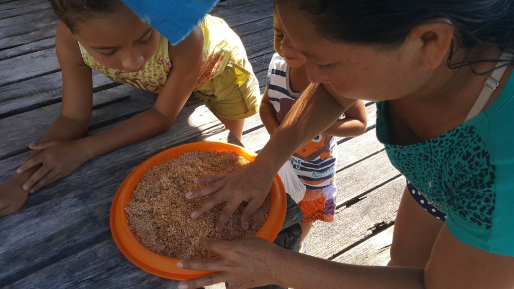 As soluções tradicionais e locais ainda são as preferidas em termos de medicina e produção de alimentos. Na foto, uma família está produzindo um pó antibactericida e cicatrizante a partir da semente de uma planta endêmica.