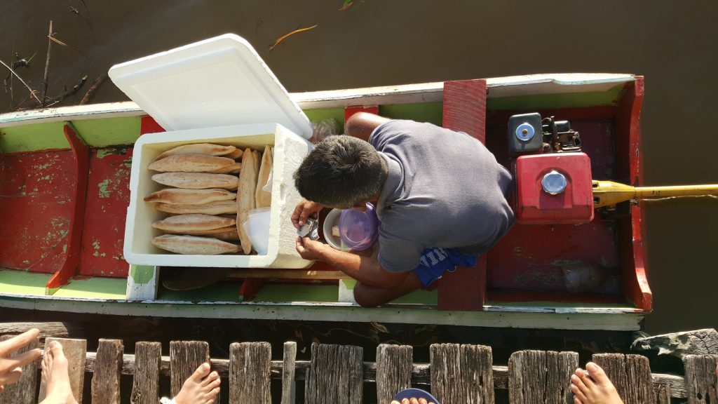 Inclusive, tudo chega de barco na sua casa: do pãozinho feito pelo padeiro da comunidade pela manhã à venda de carne de caça que foi demais para seu vizinho. Tem-se também o costume do comércio ambulante por barcos: não é raro passar alguém que vem de longe vendendo utensílios.