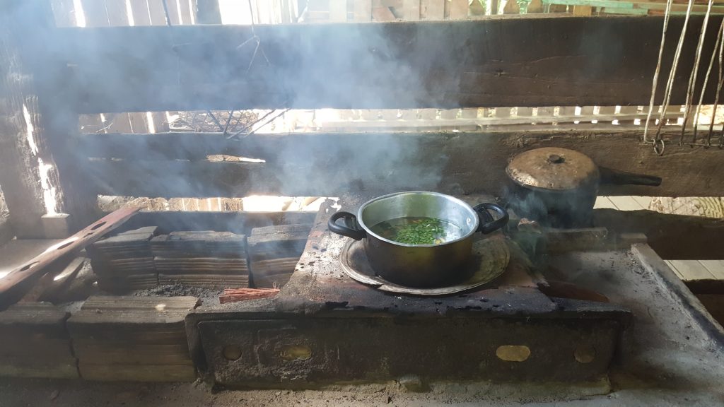 Mas há ainda quem opte por cozinhas tradicionais com forno a lenha (na panela, um vatapá paraense saindo)!