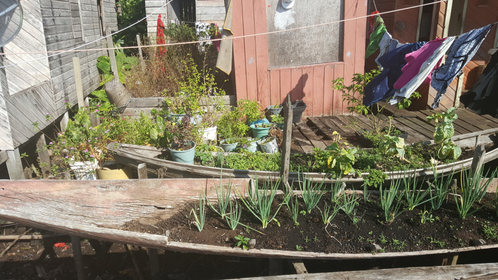 Mas se não há terra seca, onde se planta? Algumas plantas nativas (como o próprio açaí) se dão bem em zonas alagadas ou de igapó. Já os ribeirinhos constroem plataformas e caixas de madeira onde fazem suas hortas. Até antigos barcos que estão com pequenos defeitos se tornam base para plantações.